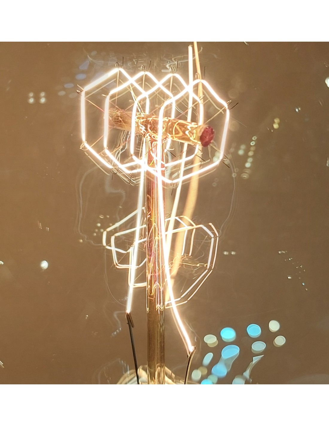 Bombilla incandescente de filamento de carbono. El filamento incandescente de este modelo está dispuesto en forma de espiral. Ideal para uso decorativo ya que da una luz suave y en tono extracálido.
