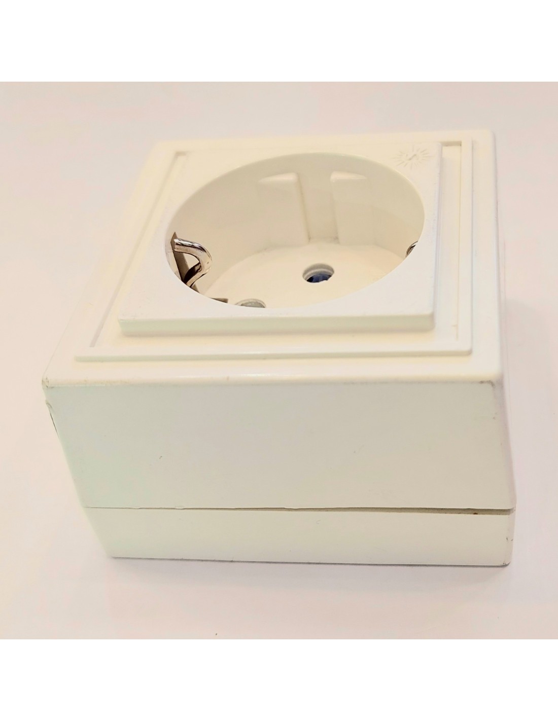 Enchufe superficie con toma de tierra color blanco. Dimensiones: 65 X 65 X 43mm.