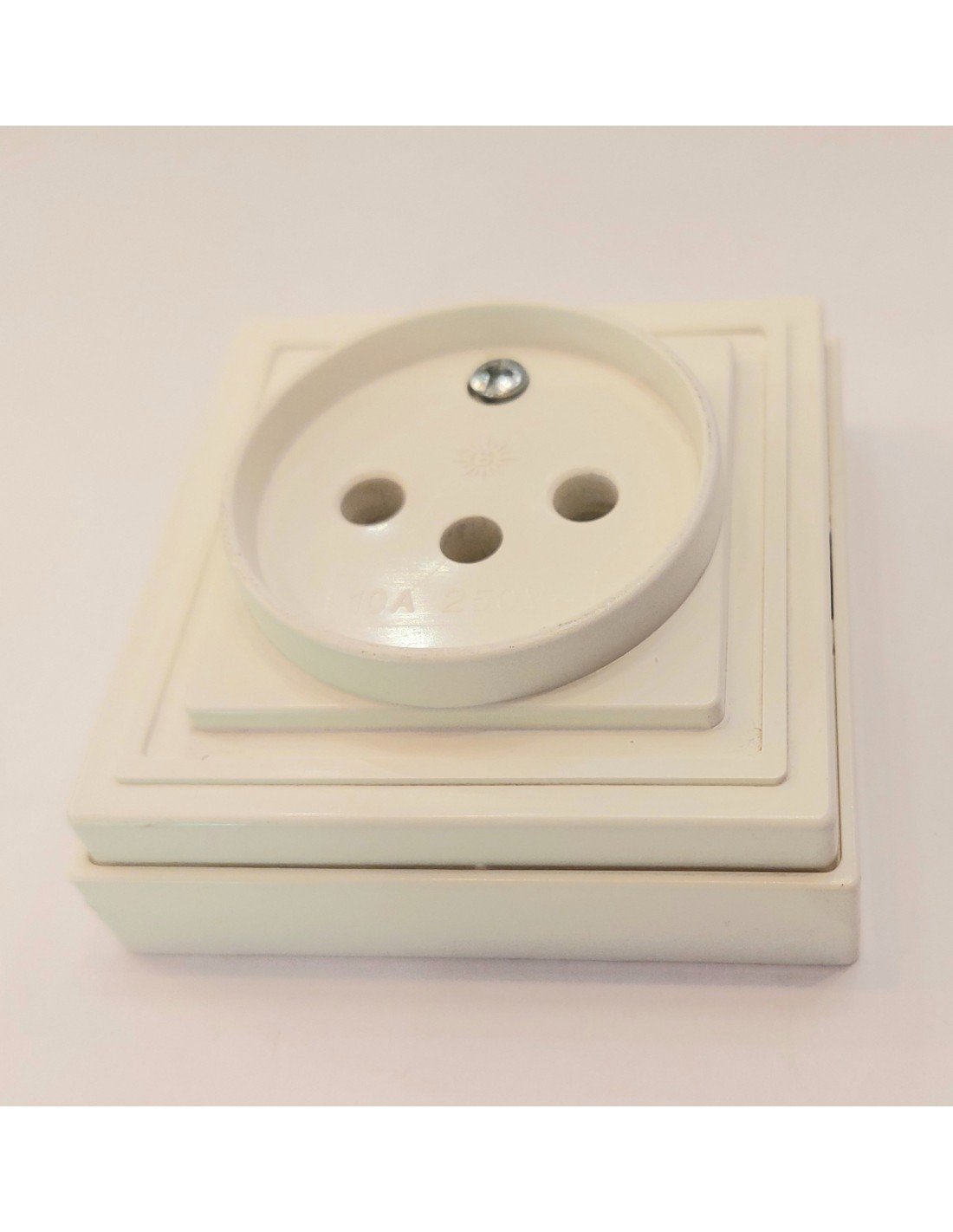 Enchufe superficie color blanco con toma de tierra desplazada. Dimensiones: 65 X 65 X 28mm.