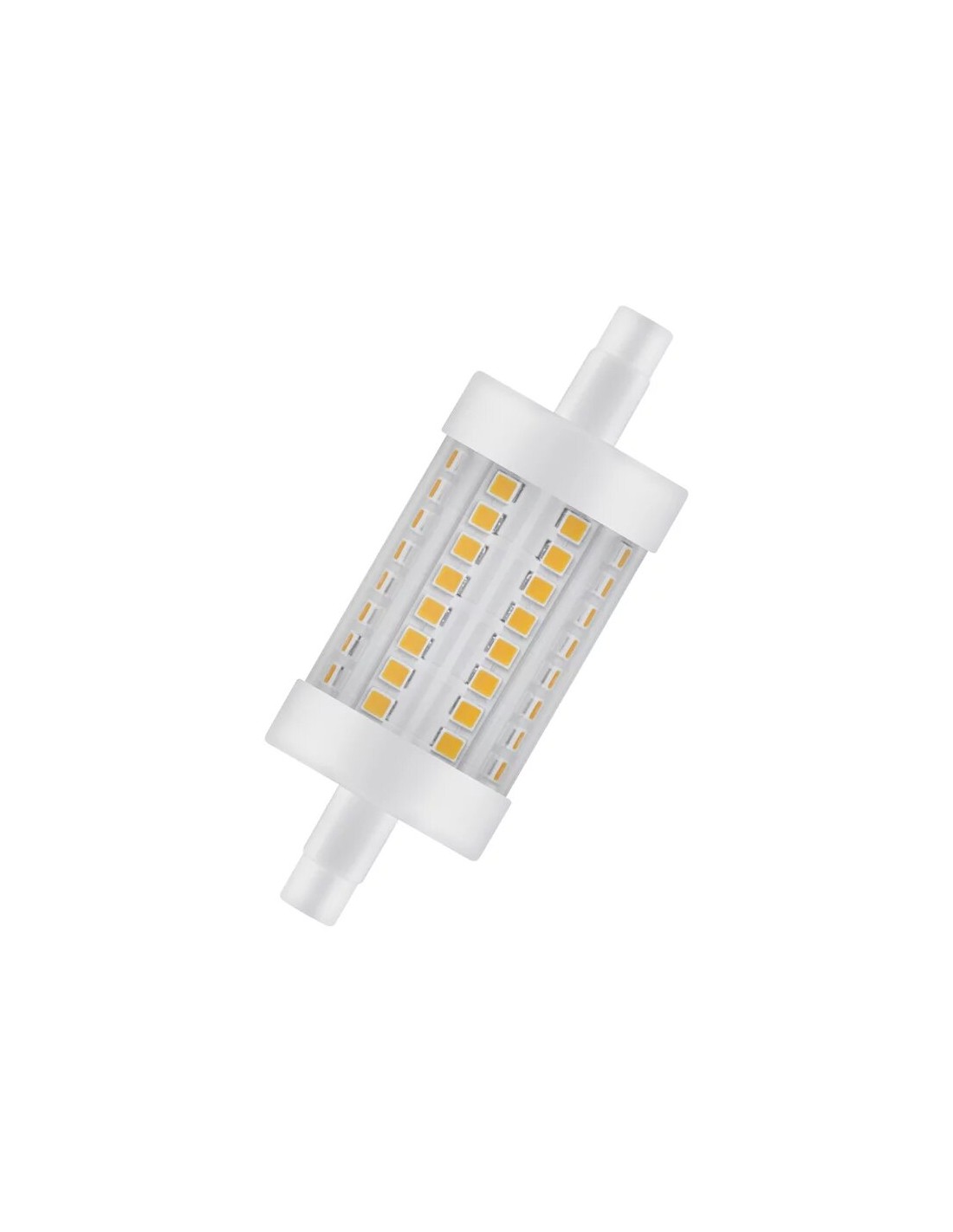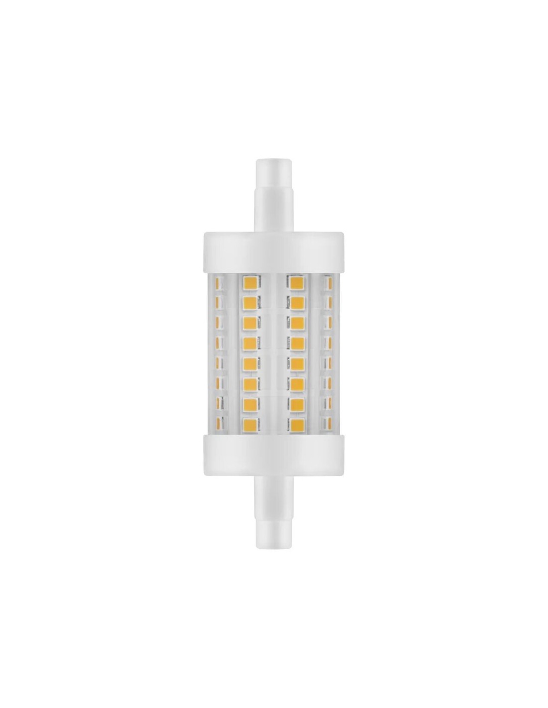 Bombilla led lineal que sustituye a las bombillas halógenas lineales de 78mm. A pesar de su mayor diámetro se puede ubicar en la mayoria de las luminarias ya que los contactos laterales están descentrados respecto al eje central. Representa un importante ahorro en relación a los modelos halógenos ya que su consumo es mucho menor y sus horas de vida mucho más elevadas.