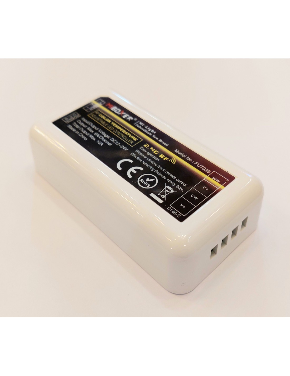 Mi Light 3938. Driver para tiras de led pararegular la intensidad y la temperatura de color. Controlado por radiofrecuencia. 12-24V. Máximo 6A por canal. 72W para tiras de led a 12V. 144W para tiras de led a 24V. Dimensiones: 8,4 X 45 X 2,3cm.