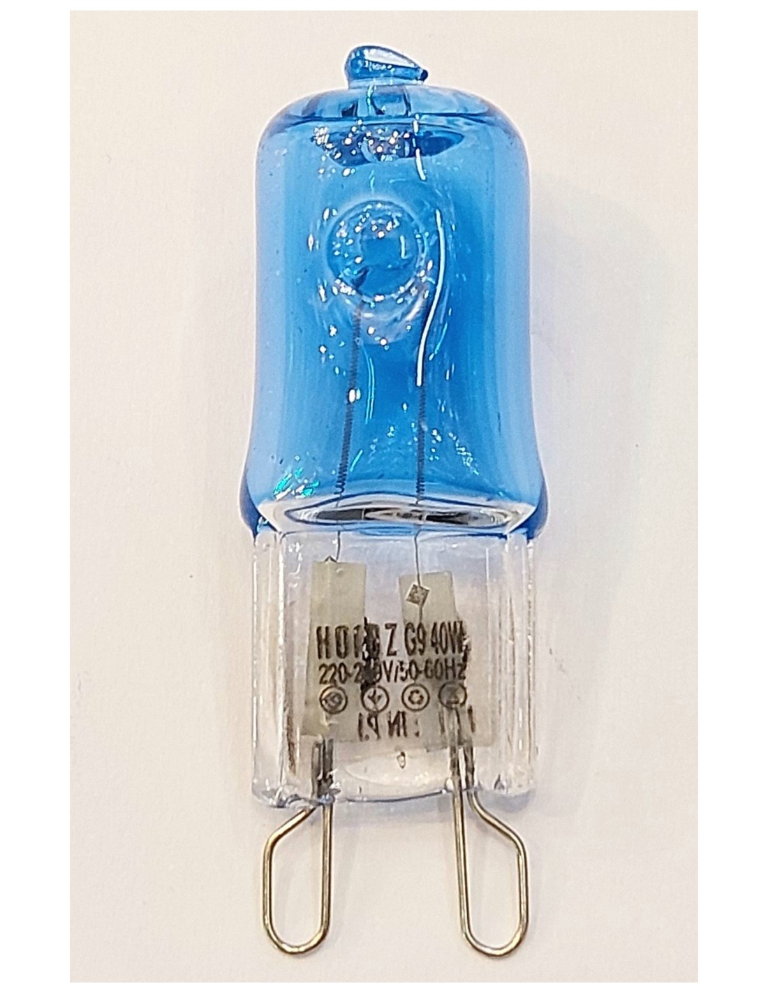 Hepoluz 41390. Bombilla halógena G9 220-240V 40W. Color azul. La bombilla emite luz blanca fría, ideal para lectura. Dimensiones: 42 X 12mm.