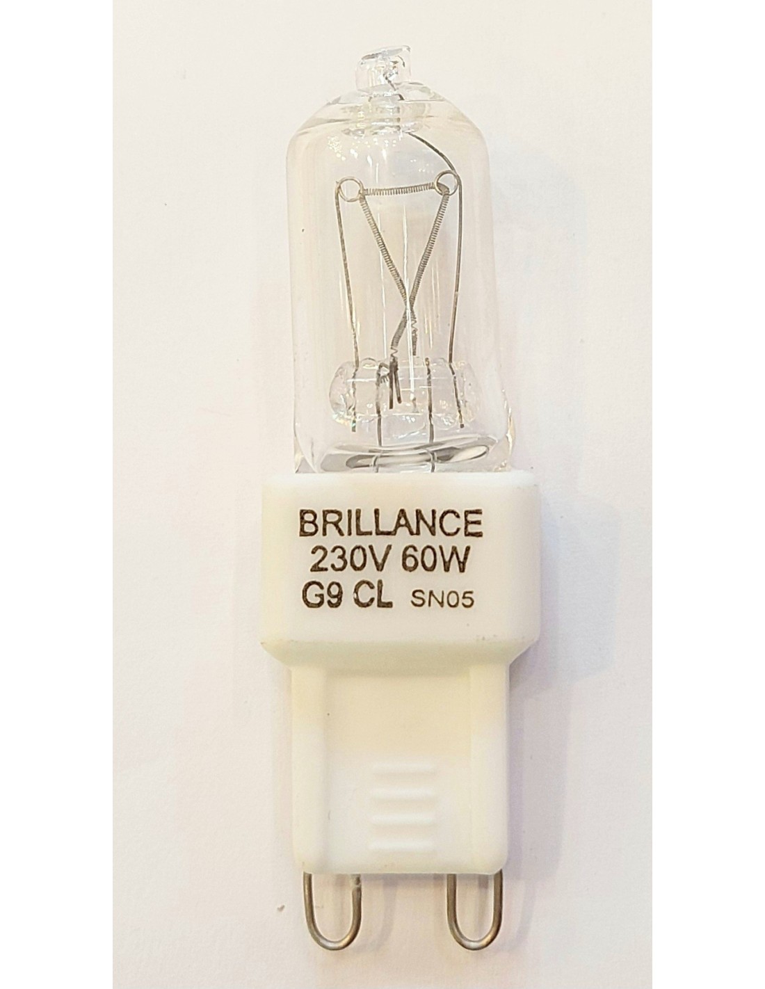 Brillance 133041. Bombilla halógena clara 230V 60W G9. 800 Lumen. 2.000 Horas. Dimensiones: 57 X 13mm. Luz cálida.