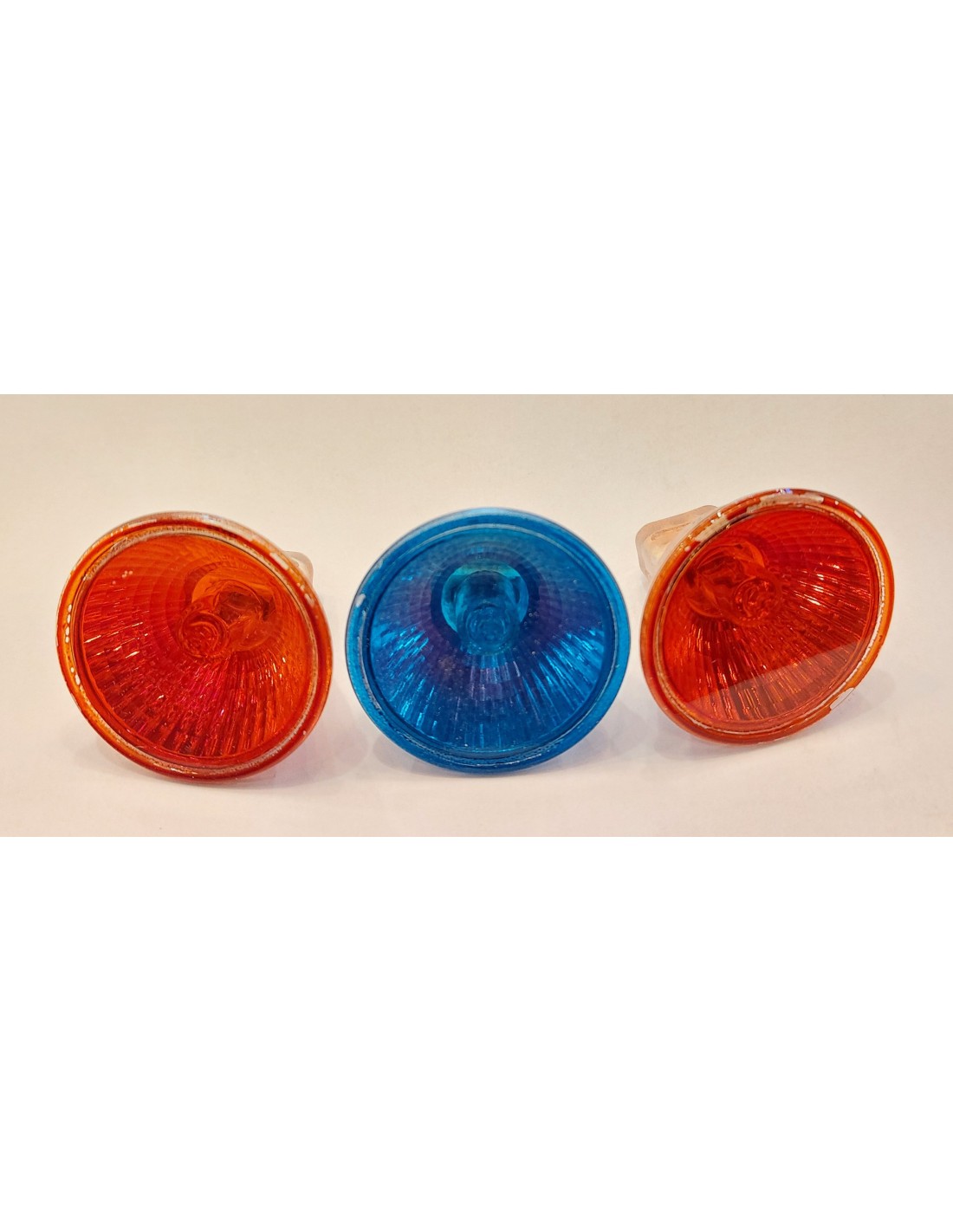 Kit de 3 bombillas halógenas en formato MR11 de 12V 20W. 2 de ellas es de color rojo y la otra en color azul.