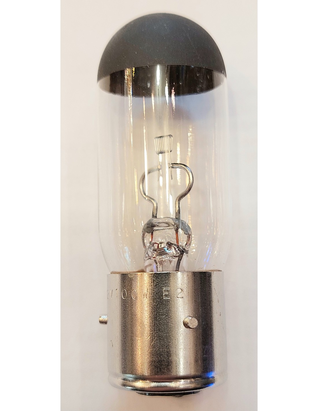Lámpara de proyector con funcionamiento a 12V y potencia de 100W en forma tubular y cúpula negra. El casquillo que es de bayoneta 21, dispone a media altura y dispuestos de forma equisdistantes entre ellos, de 3 tetoncillos que sirven de enganche.